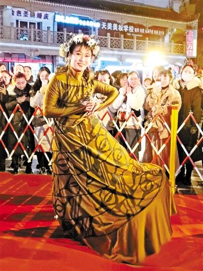 當(dāng)晚7時許,途經(jīng)表演現(xiàn)場的人流從四面八方聚攏于此,人們頻頻舉起手機將鏡頭對向眼前裙袂飛揚、舞姿優(yōu)美的“大地灣女神”和頷首微笑、靜若處子的“東方微笑”,一時間,閃光燈忽明忽暗此起彼伏,行人你來我往人聲鼎沸,步行街頃刻間歡聲笑語、熱鬧非凡。記者發(fā)現(xiàn),扮作“不倒翁”的“女神”模仿大地灣出土的人頭瓶外部特征,而一旁采用懸浮藝術(shù)呈現(xiàn)的“小沙彌”,打禪靜坐、頷首微笑。
