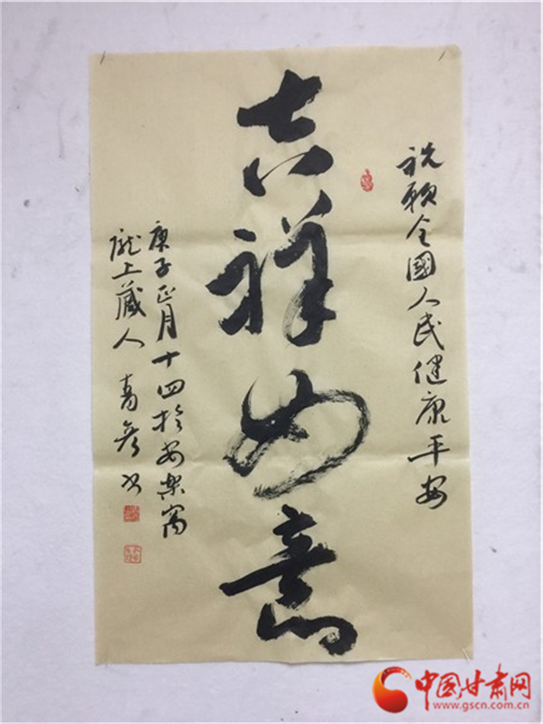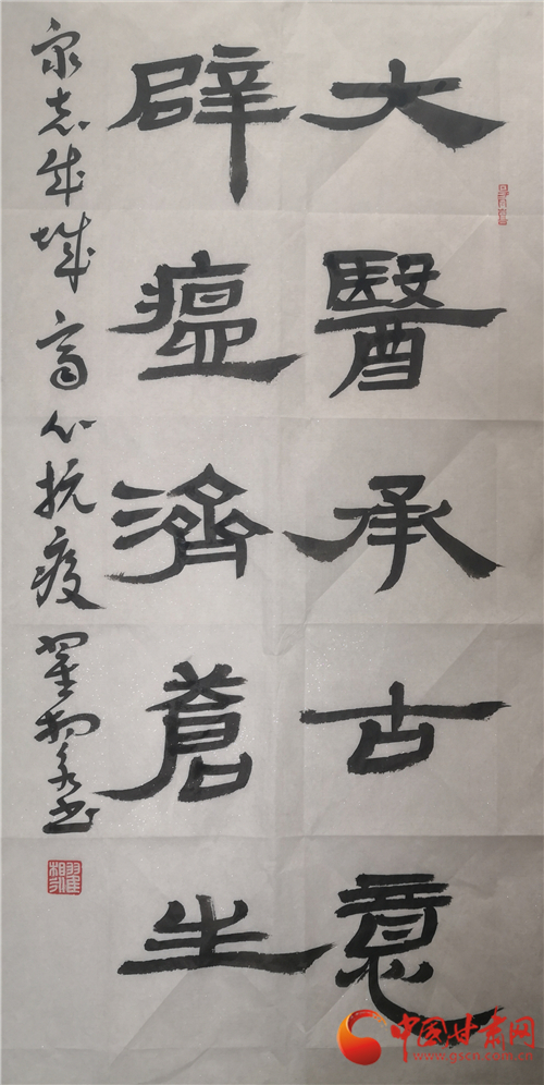 中國甘肅網(wǎng)2月12日訊(本網(wǎng)記者 張?zhí)m琴 張玉芳)2020年新春,面對(duì)突如其來的新冠肺炎疫情,全國人民正在以必勝的信心全力打贏這場沒有硝煙的戰(zhàn)爭。翰墨傳情,為抗疫助力。2月11日,由甘肅省文聯(lián)主辦,甘肅省文聯(lián)所屬文藝家協(xié)會(huì)、中國甘肅網(wǎng)承辦的甘肅文藝界戰(zhàn)“疫”主題作品展播活動(dòng)正式啟動(dòng)。我省12位書法大家揮毫潑墨,這些作品為所有奮戰(zhàn)在抗疫一線和防控疫情工作的平凡天使加油鼓勁,祈禱祝福,用文藝凝聚起抗擊疫情的強(qiáng)大精神力量,為我省防控疫情宣傳助力,受到了社會(huì)各界的贊譽(yù)。