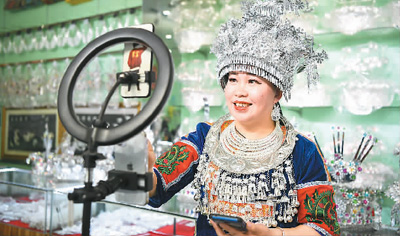 在古州鎮(zhèn)老街,銀飾店店主在進行網(wǎng)絡(luò)直播銷售銀飾。