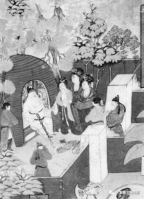 左壁彌勒經(jīng)變中有幅壁畫叫做《老人入墓圖》。這幅圖描繪的不是為一個(gè)去世的老翁舉行葬禮,而是一位感到死期將至的老人來(lái)到墳?zāi)骨埃c親人訣別。然后他便獨(dú)自進(jìn)入墓室,與外界斷絕往來(lái),直到去世。