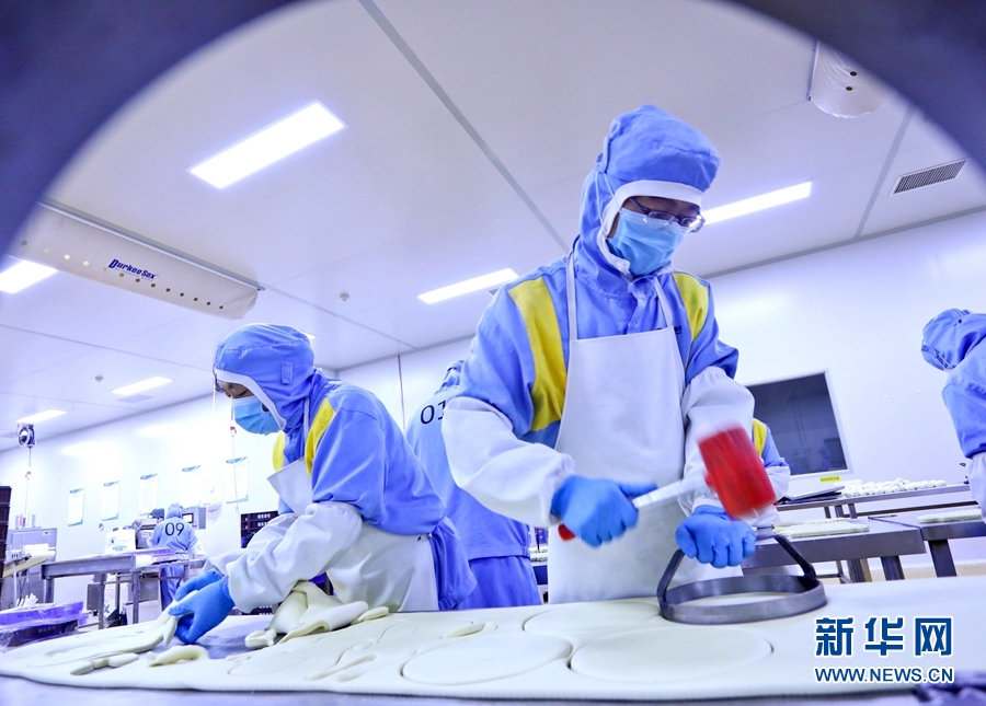 9月9日,甘肅省張掖市甘州區(qū)一月餅加工車間內(nèi),工作人員正忙碌制作中秋“土月餅”。新華網(wǎng)發(fā) (王將 攝)