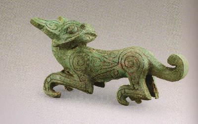 獸頭向前沖,角向前刺,扁尾上翹,四足跨張作角斗狀,全身鑄有獸毛的紋飾。角和尾可拆卸。獨(dú)角獸是傳說中的一種神獸,隨葬在墓中,起鎮(zhèn)墓辟邪的作用。