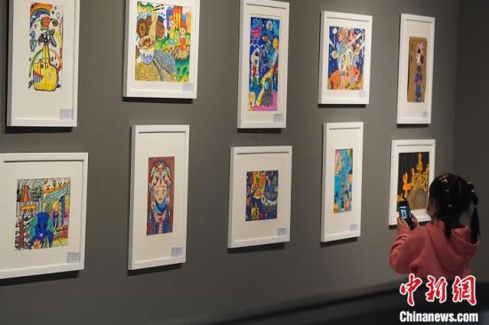 小朋友參觀少兒美術展覽,用手機拍照留影。