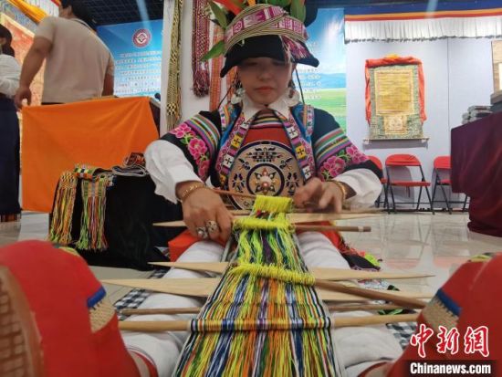 6月8日,甘肅省張掖市,甘肅甘南藏族自治州舟曲縣藏族姑娘,向民眾展示省級非遺織錦帶。閆姣 攝