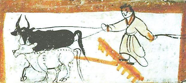二牛抬杠圖 出自嘉峪關(guān)魏晉墓磚畫