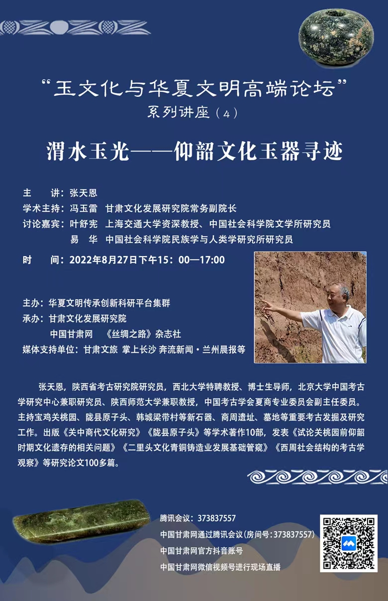 中國甘肅網8月28日訊  27日下午15:00—17:00,由西北師范大學華夏文明傳承創(chuàng)新科研平臺集群主辦,甘肅文化發(fā)展研究院、中國甘肅網、《絲綢之路》雜志社聯(lián)合承辦的“玉文化與華夏文明高端論壇”第四講《渭水玉光——仰韶文化玉器尋跡》成功舉辦。