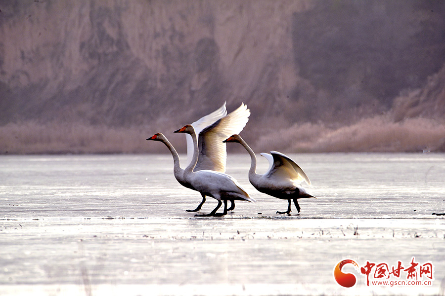 初冬,位于平?jīng)鍪徐o寧縣境內(nèi)的懸鏡湖迎來(lái)白天鵝在此組團(tuán)落腳,這是今年以來(lái)天鵝首次“光臨”懸鏡湖。