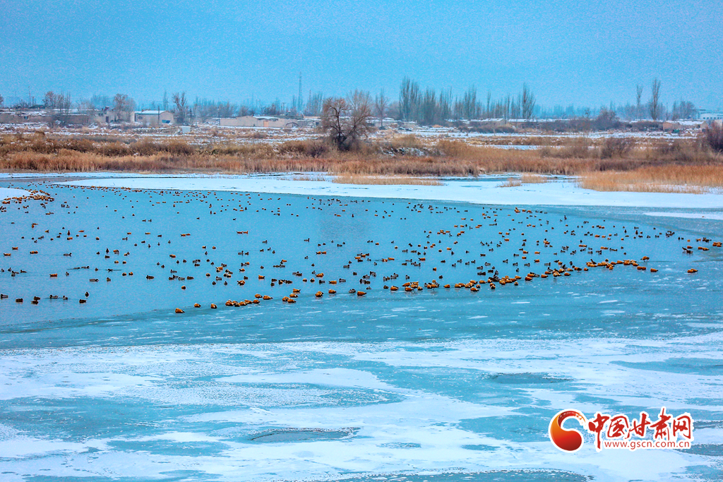 12月20日,在甘肅省酒泉市銀達鎮(zhèn)花園水庫,一群候鳥正在戲水、覓食,為祁連山下的戈壁大地增添了一道亮麗的景色。