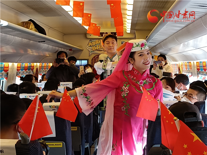 飛天與花兒相擁,甘肅與寧夏直通。蘭銀高鐵中蘭段開通,也讓銀蘭高鐵全線貫通。為了慶祝這一歷史時(shí)刻,D9058次列車乘務(wù)組準(zhǔn)備了精彩的節(jié)日?!痘▋号c少年》展演寧夏風(fēng)情,遇見塞上花開。敦煌樂舞,充滿甘肅元素講述飛天故事,巧妙的節(jié)目安排生動(dòng)地展示了甘肅、寧夏兩省區(qū)的文化元素,讓旅途不僅有一路風(fēng)光,更有一路風(fēng)情。