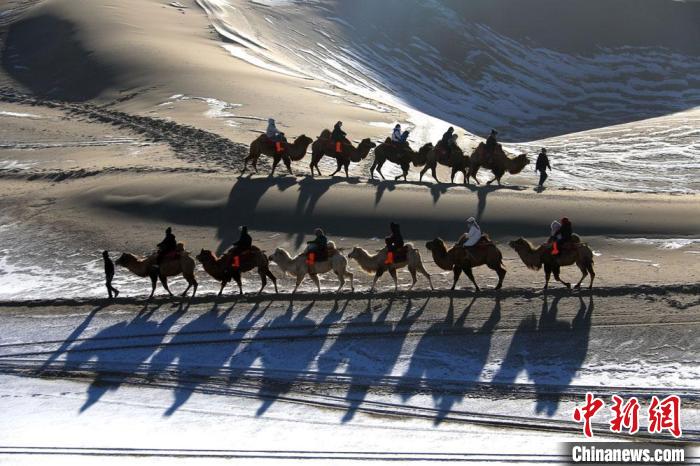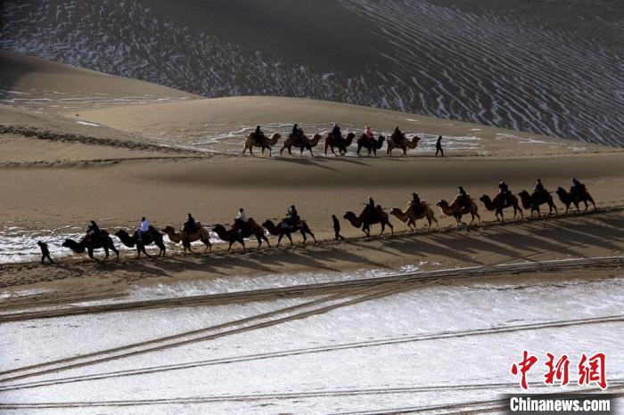 1月27日,游客騎駱駝暢游敦煌鳴沙山。魏佳秀 攝