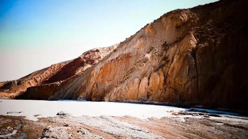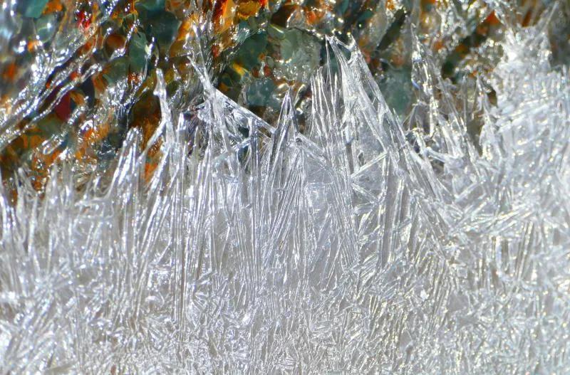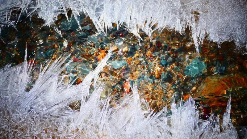 在丹霞山間可見(jiàn)一條冰凍似凍的水溪,系小泉河支流,在陽(yáng)光下透過(guò)像東北冬天窗花一樣的冰花,可看見(jiàn)水下的鵝卵彩石,望遠(yuǎn)看去小溪像一條披上雪衣的彩龍。