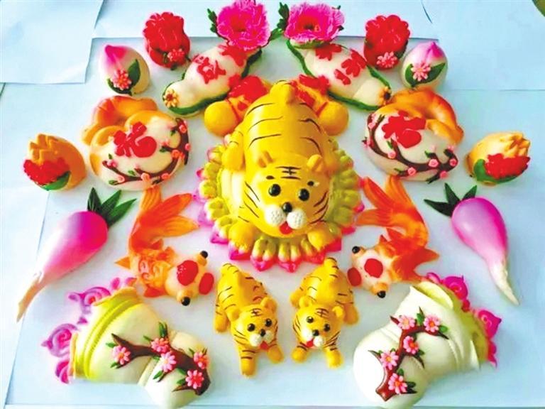 紅艷艷的牡丹花、形象各異的小動(dòng)物……王霞制作的花饃不再是普通的食材,而是栩栩如生的藝術(shù)品。放在展臺(tái)最中間的一個(gè)巨型花饃格外吸睛。這個(gè)花饃用一層層面餅做底座,每一層面餅上都有牡丹、月季、百合等各種花卉競相開放,不時(shí)有蝴蝶和小鳥停留在花朵上,充滿著喜意。