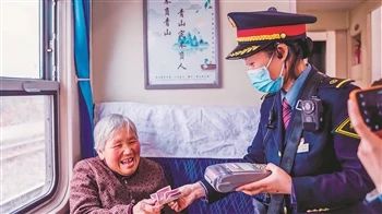 7505/7506次列車(chē)長(zhǎng)在途中為老年旅客辦理現(xiàn)金補(bǔ)票業(yè)務(wù)。強(qiáng) 科 攝