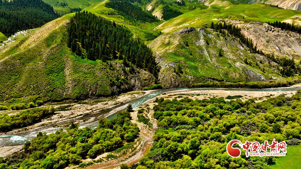 7月22日,祁連山國(guó)家公園甘肅省張掖市肅南裕固族自治縣大河鄉(xiāng)段,藍(lán)天白云下,巍峨壯麗的祁連山蒼松翠柏矗立其間,綠草如茵、水光粼粼,如同一幅壯美與秀麗并存的山水畫卷。