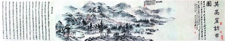 民國初年,張維返回蘭州之后,仍然念念不忘敦煌經(jīng)卷,曾三赴河西考察敦煌莫高窟。1940年,張維第三次考察敦煌莫高窟返回途經(jīng)武威時,前往拜訪好友、甘肅近代著名書畫家范振緒,為其講述敦煌莫高窟的坎坷境遇與現(xiàn)狀。在交流中,張維請范振緒繪制《敦煌訪古圖》畫卷。1941年,范振緒繪制完成之后,張維將此圖帶回蘭州,并邀請張大千、于右任、高一涵、馮國瑞、曹經(jīng)沅等著名詩人題詠。
