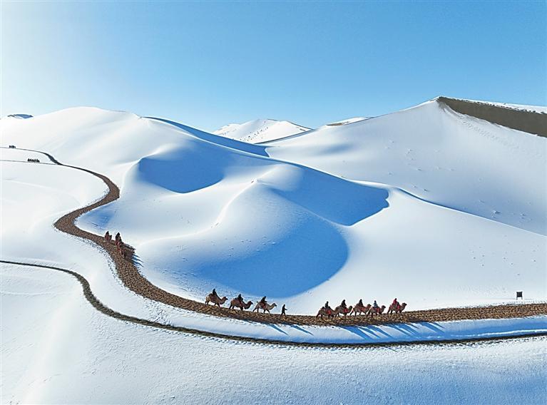 受冷空氣影響,11月14日晚,敦煌市迎來(lái)入冬以來(lái)的首場(chǎng)降雪。雪后的鳴沙山月牙泉景區(qū)銀裝素裹,景色如畫(huà)。游客踏雪而來(lái),拍照打卡,感受大漠里難得一遇的雪后美景。
