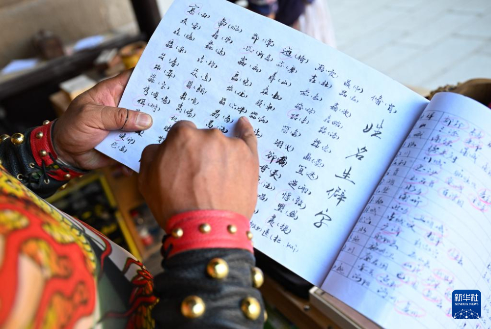 在甘肅嘉峪關(guān)關(guān)城景區(qū),李森在攤位上查閱自己編寫的含有生僻字讀音、城市古地名等內(nèi)容的小冊子(7月14日攝)。新華社記者 陳鐘昊 攝