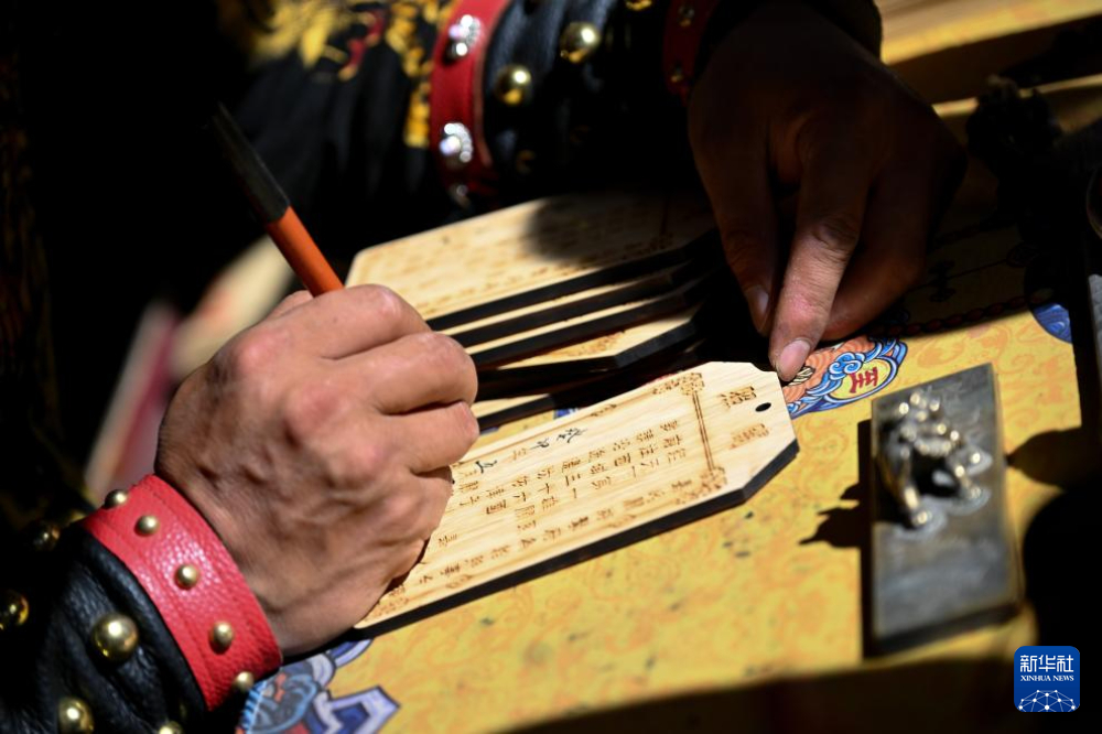 7月13日,在甘肅嘉峪關(guān)關(guān)城景區(qū),李森為游客手寫文創(chuàng)產(chǎn)品“關(guān)照”。新華社記者 劉金海 攝