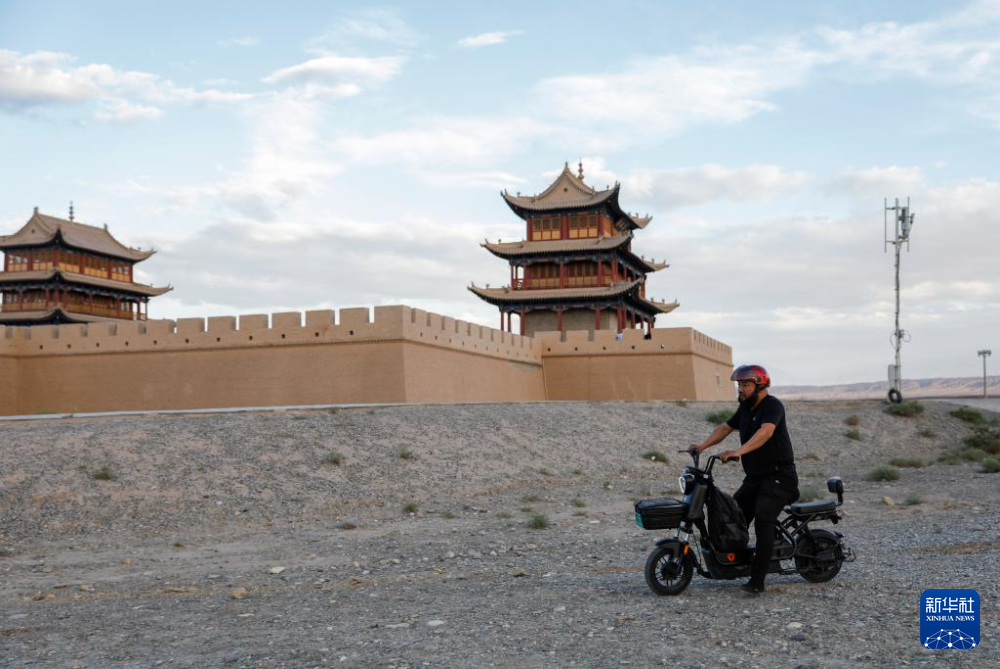 7月13日,李森結(jié)束一天的工作離開甘肅嘉峪關(guān)關(guān)城景區(qū)騎電動車回家。新華社記者 方欣 攝