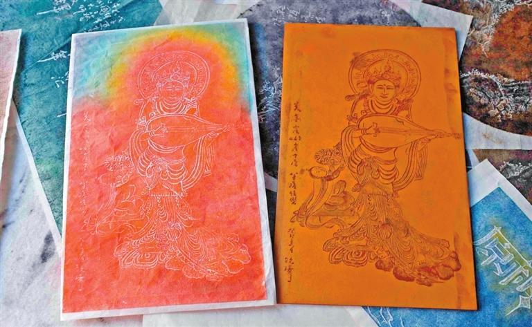 走進(jìn)工作室,墻壁四周掛滿了雅致的傳拓字畫,阮琦也向記者講述了拓印畫——“拓印敦煌”系列的始末。