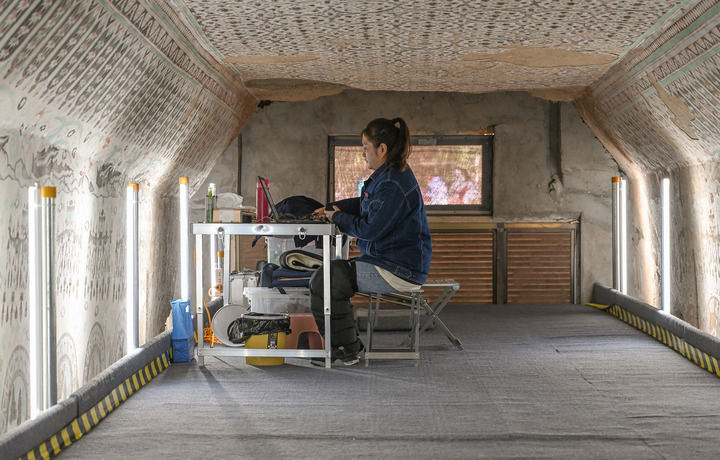 2023年8月3日,在敦煌莫高窟正在保護(hù)修繕的第55窟內(nèi),一位文保工作者對(duì)采集的數(shù)據(jù)進(jìn)行整理。新華每日電訊記者 李賀 攝