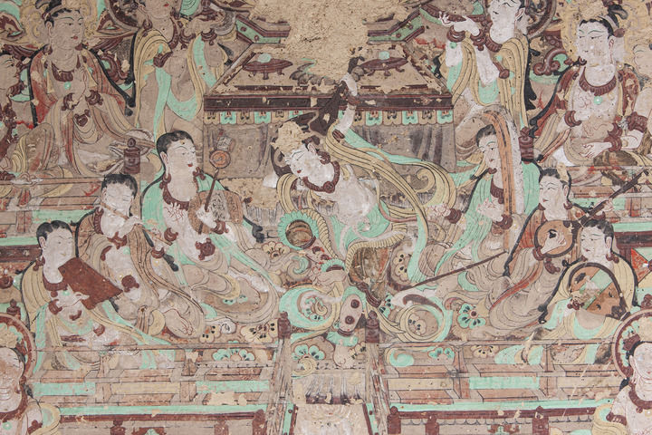 莫高窟第112窟-壁畫-主室北壁-報(bào)恩經(jīng)變之樂舞圖。(敦煌研究院供圖)