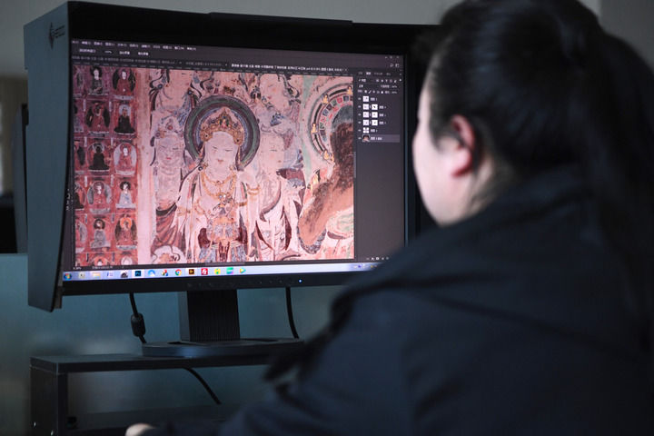 2023年4月25日,敦煌研究院文物數(shù)字化保護(hù)團(tuán)隊(duì)圖像處理人員年海麗在拼接壁畫圖像。 新華每日電訊記者 陳斌 攝