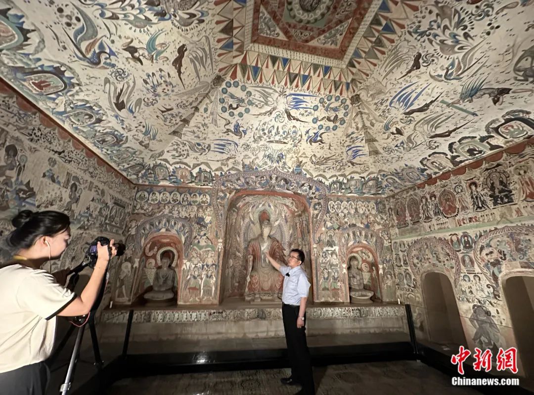 2023年7月,敦煌研究院副院長張?jiān)衷诙鼗湍呖叩?85窟原大復(fù)制窟內(nèi),接受中新社“東西問”獨(dú)家專訪。丁思 攝
