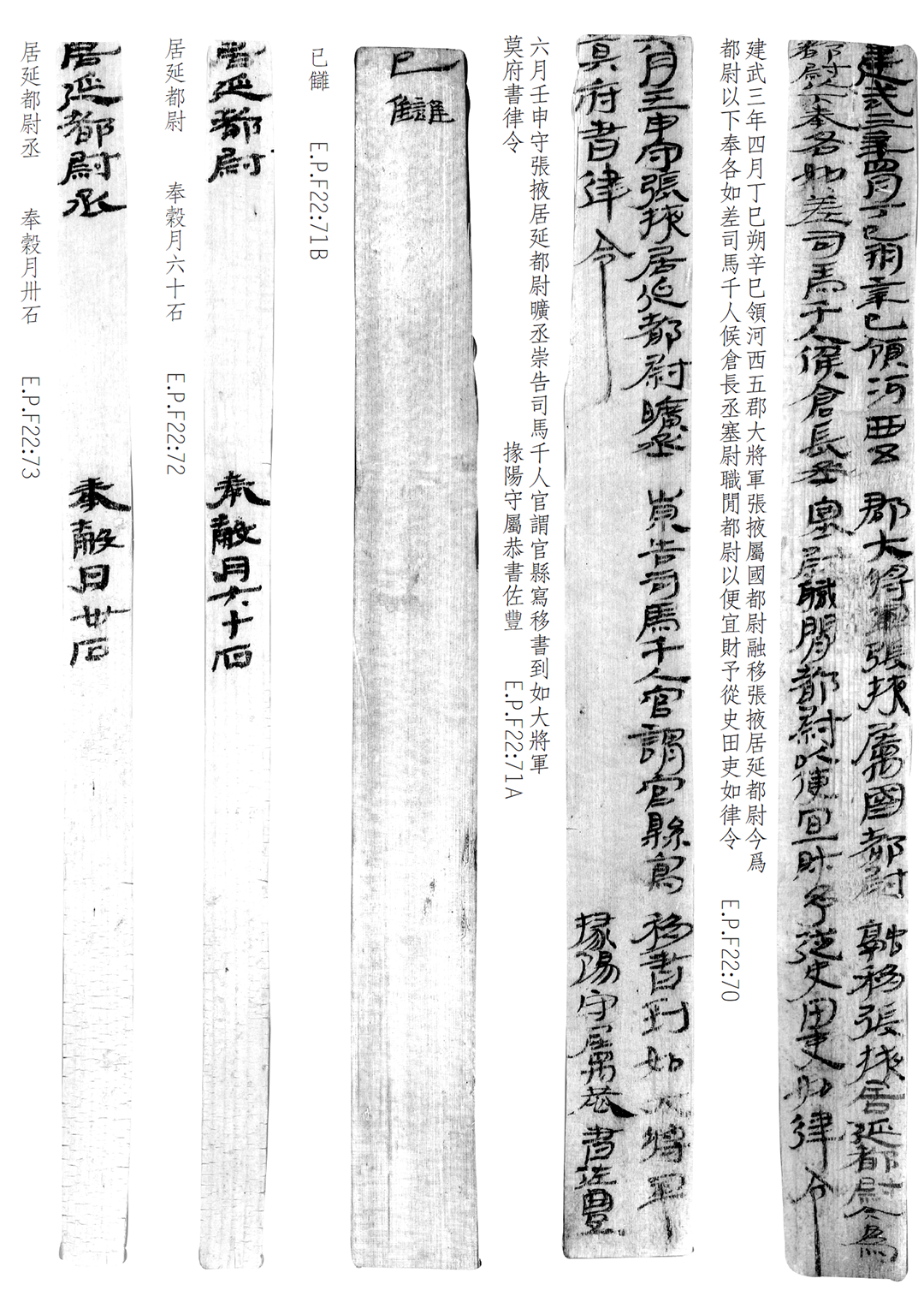 1974年8月出土于甲渠候官遺址第22號(hào)房址內(nèi)。簡(jiǎn)冊(cè)由10枚簡(jiǎn)組成,每簡(jiǎn)長(zhǎng)22.8厘米,前兩簡(jiǎn)寬2.5厘米,其余8簡(jiǎn)寬1.4厘米。全文200字。內(nèi)容為東漢建武三年(公元25年)竇融統(tǒng)治河西期間留下的一份完整的財(cái)政文書。簡(jiǎn)文是關(guān)于居延都尉府吏員奉谷標(biāo)準(zhǔn)的通知,由領(lǐng)河西五郡大將軍張掖屬國(guó)都尉竇融幕府下發(fā),簡(jiǎn)言“如律令”可知其指令具有法律效力。