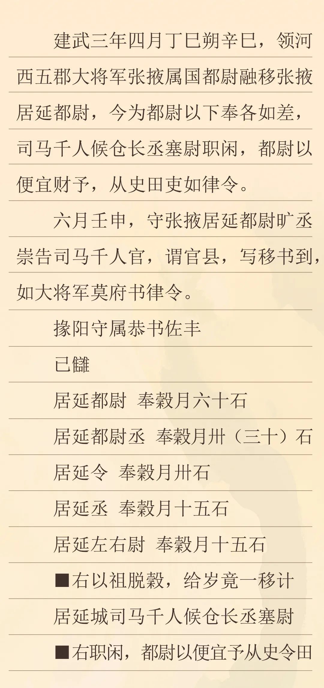 這封冊(cè)書記載了建武三年,竇融管轄河西時(shí)發(fā)布的一條關(guān)于都尉以下官吏奉谷等差的命令。根據(jù)竇融發(fā)布的新規(guī)定,我們可以看到,秩比二千石的居延都尉月奉谷僅為六十石,史書有“十斗一斛”及“十斗一石”的記載,此六十石即是六十斛,相比于史書記載中比二千石每月百斛的俸例要少,而其余官吏的俸祿也相應(yīng)要少,雖然漢代不同時(shí)期的官吏俸祿存在變化,但對(duì)比所見的這種情況,可能也跟兩漢之交戰(zhàn)亂頻仍的社會(huì)環(huán)境有重要關(guān)系。