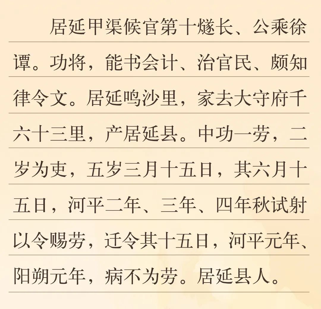 此簡(jiǎn)1972年出土于破城子甲渠候官遺址,分三段書(shū)寫(xiě)。內(nèi)容為居延甲渠候官第十燧長(zhǎng)徐譚的功將文書(shū)。“功將”即“功勞墨將”,功勞墨將文書(shū)指官吏個(gè)人才能與勞績(jī)的登記名單,是官方對(duì)官吏功勞下發(fā)的認(rèn)定通知。
