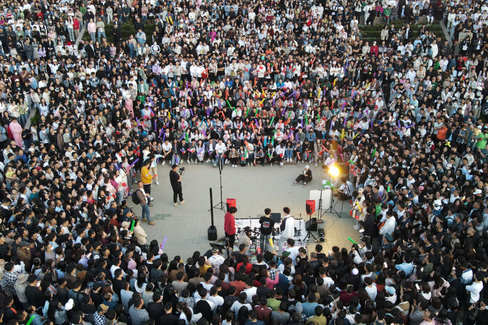 “最近在短視頻平臺(tái)上‘蘭州黃河大合唱’的話題很火,我們刷到后就趕過(guò)來(lái)了?,F(xiàn)場(chǎng)人山人海,氛圍感拉滿,有種露天現(xiàn)場(chǎng)酒吧的感覺(jué)。”趁著周末,來(lái)自蘭州城市學(xué)院的大學(xué)生陳佳儀和4名好友,相約打卡這個(gè)蘭州夜游新地標(biāo),感受黃河之濱的青春與活力。