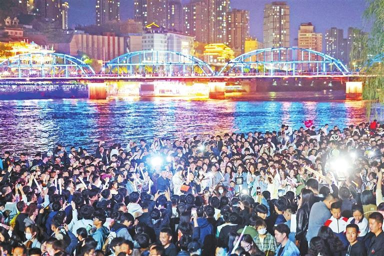 作為蘭州的地標(biāo)之一,中山橋已經(jīng)是來蘭游客必“打卡”的景點?;馃?ldquo;出圈”的“黃河大合唱”成為蘭州旅游新體驗。華燈初上,游客和市民齊聚黃河岸邊,隨著音樂齊聲合唱,場面壯觀,氣氛熱烈。“五一”假期首日,蘭州文旅市場迎來火爆“開門紅”,接待游客達(dá)到了86.42萬人次。