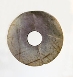 玉璧(編號總0129:5)直經(jīng)9厘米,單面鉆孔,大端孔徑4.4厘米,小端孔徑4厘米,厚度0.55—0.7厘米,璧外緣有磕碰痕。