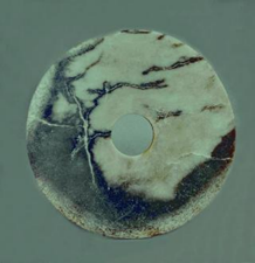 玉琮(編號IB1049),屬三件玉琮中形體最小的,外表呈夾有青黑斑點的灰白色,形制屬扁矮方型,其中外方一角下削,與前兩者相同。高僅2.7厘米,孔經(jīng)3.8厘米,外徑4.8厘米。玉璧(編號IB1066),直經(jīng)25.4厘米,璧呈豆綠色夾有大量所謂海藻紋,璧面傾斜最甚,最厚處0.8厘米,最薄處僅0.2厘米,邊緣制作亦欠規(guī)整。