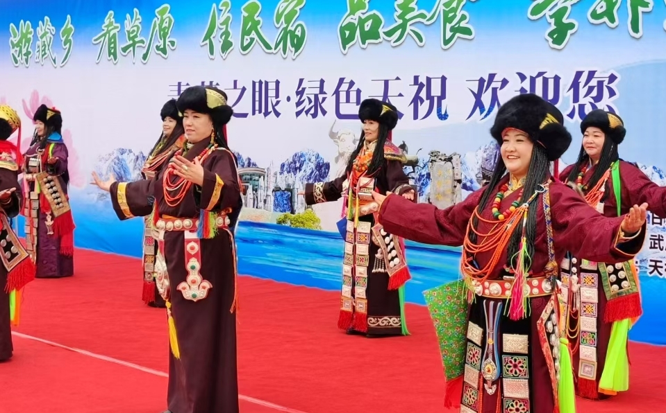 在天??h抓喜秀龍阿尼嘎卓帳篷城,身著藏族服飾的美麗卓瑪向采風(fēng)團(tuán)獻(xiàn)上了潔白的哈達(dá),華銳藏歌、華銳則柔、華銳鍋莊等獨(dú)具特色的文藝演出讓現(xiàn)場觀眾拍手稱贊。