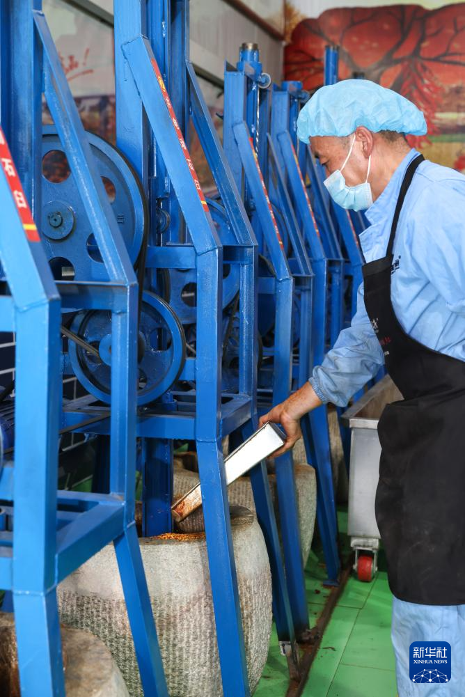 7月22日,工作人員在甘肅天水市甘谷縣安遠(yuǎn)鎮(zhèn)的辣椒烘干和加工車(chē)間里操作電動(dòng)石臼。新華社記者 呂帥 攝