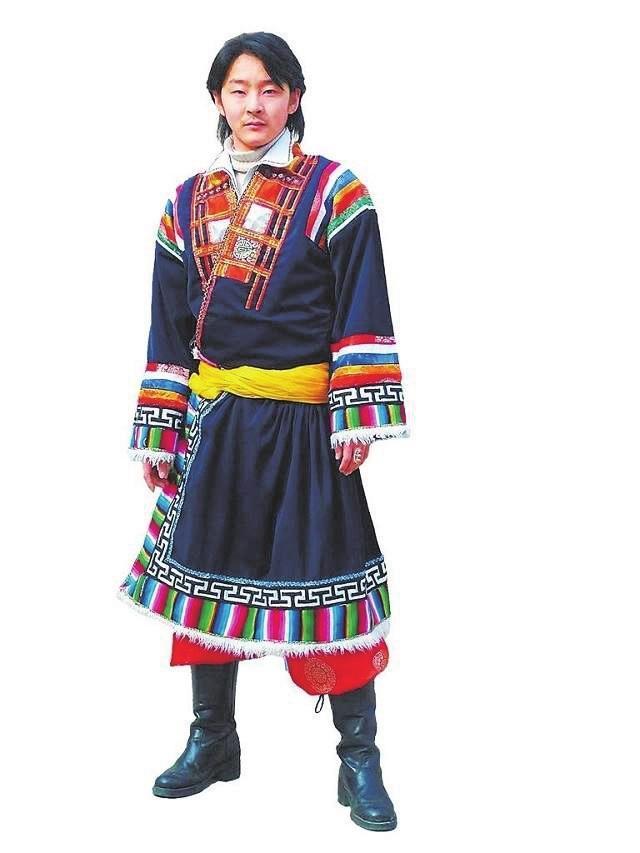 甘肅藏族因地理條件與生產(chǎn)生活方式的不同,可區(qū)分為牧區(qū)、農(nóng)區(qū)和半農(nóng)半牧區(qū)三種類型,相應(yīng)其服飾也有所差異,有生活裝和節(jié)日盛裝的區(qū)別。牧區(qū)服飾以甘南瑪曲、夏河為典型,男女都內(nèi)著半高領(lǐng)、左衽的滾邊夾襖,多用紅、綠、藍、褐色綢緞制作,喜歡用水獺皮等裝飾衣襟邊。夏日穿氆氌做的“日拉”,春秋穿羊羔皮做里,外罩綢緞面的“察日”,冬天穿大羊皮縫制的“早化”。男款袍服寬大,冬袍領(lǐng)子鑲豹皮;現(xiàn)代女款藏袍吸收了近現(xiàn)代旗袍的特點,注意腰身的裁剪設(shè)計,領(lǐng)部鑲豹皮,在領(lǐng)角處裝飾彩色布條;襟裙下擺和袖口處多疊綴三種紋樣的氆氌,或用白羔皮、水獺皮和織錦花邊依次裝飾。