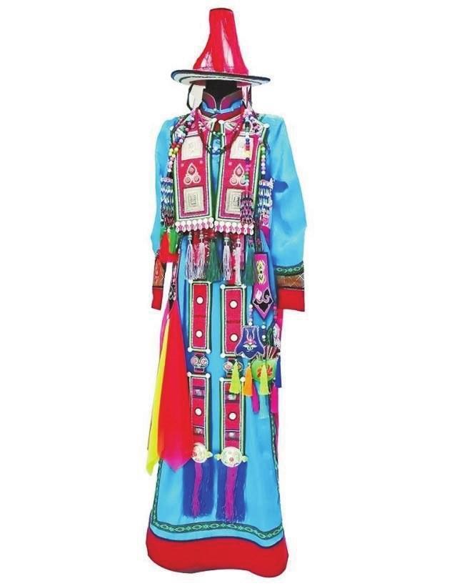 女性婚服是最隆重的,很多婚后日常服裝也在此時備好。女性婚服中最具辨識度的是頭面,長條形頭面佩戴在女子的三條長辮子上,胸前兩條,背后一條。多見布制的頭面,綴上珊瑚、綠松石、瑪瑙等,也有用紅牛皮底、黑或紅色絲絨底的頭面,鑲上銀牌、蜜蠟、珊瑚、松石等飾物,背后的一條頭面下方垂一顆紅珊瑚,上面鑲23塊白色海螺磨制的圓片,這種傳統(tǒng)頭面總重量約在五到七斤左右。傳統(tǒng)女性婚服多用藍色和綠色,以區(qū)別于著紅色服裝的“點格爾汗”天神。隨著文化的交流變化,對服裝色彩的禁忌逐漸消解,黃色、米黃色、紅色等色彩也常被新娘穿戴。