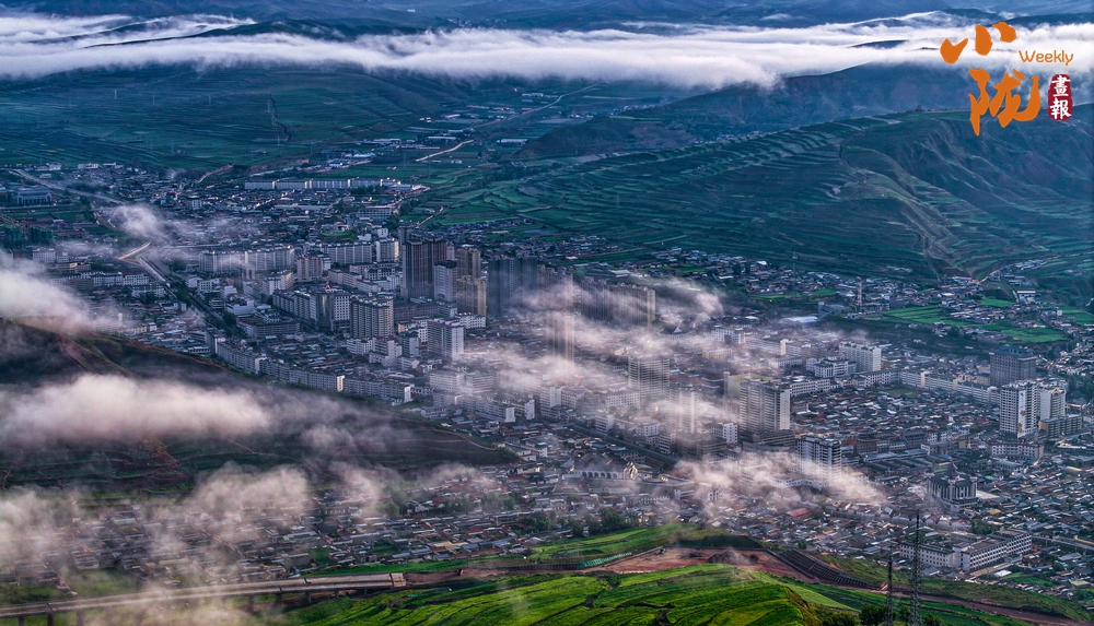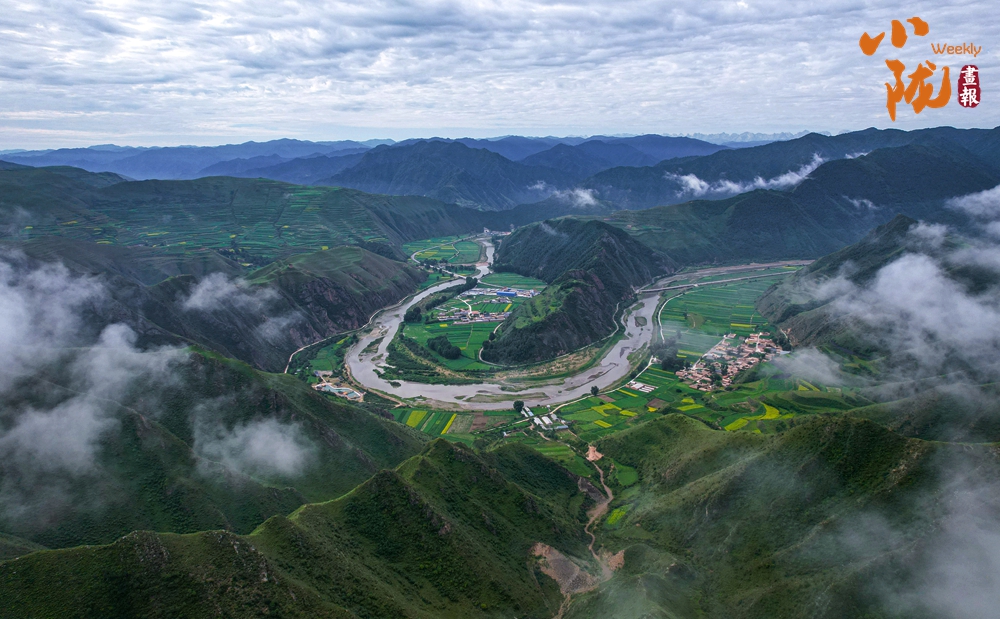 雨后放晴,山谷中的霧氣匯集升騰,化作云海環(huán)繞山峰,光線柔和空氣清涼,放眼望去,白云、青山、洮河、云海構(gòu)成唯美畫卷。