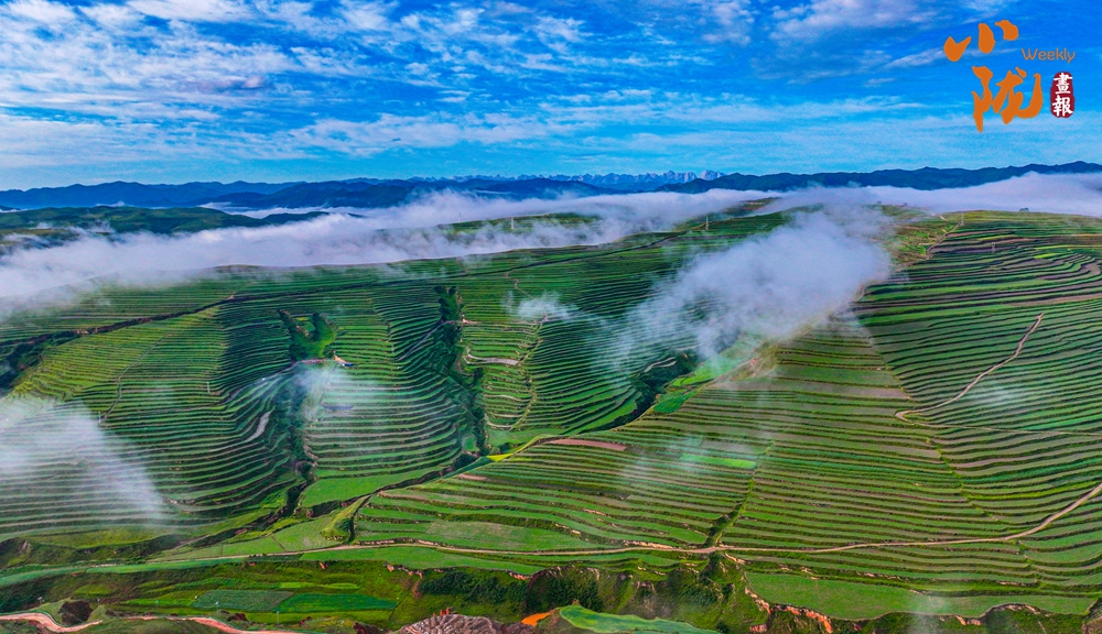 萬畝碧綠的梯田從山腳盤繞著直至山頂,高低錯(cuò)落,層層疊疊伸向遠(yuǎn)方,遠(yuǎn)遠(yuǎn)望去,像“條縷清晰”的調(diào)色板,在藍(lán)天白云的打扮下,壯現(xiàn)絢爛。