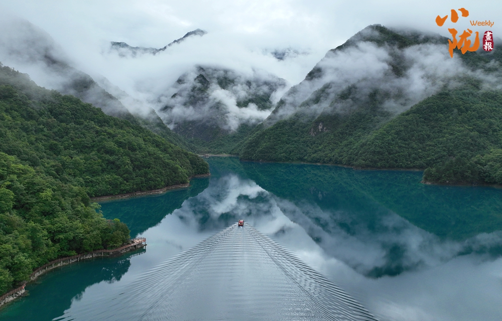兩岸種類繁多的茂密植被、清澈如玉的湖水和霧遮云繞的奇峰構(gòu)成一幅山水畫卷。