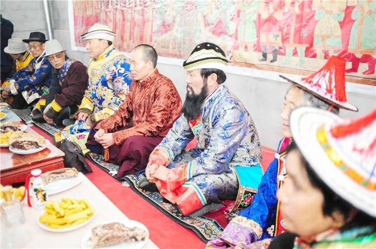 送親隊(duì)伍來到時,迎親的人們向女方客人贈送哈達(dá),表示敬意。然后,送親的人下馬飲酒吃飯,謂之“打尖”。
