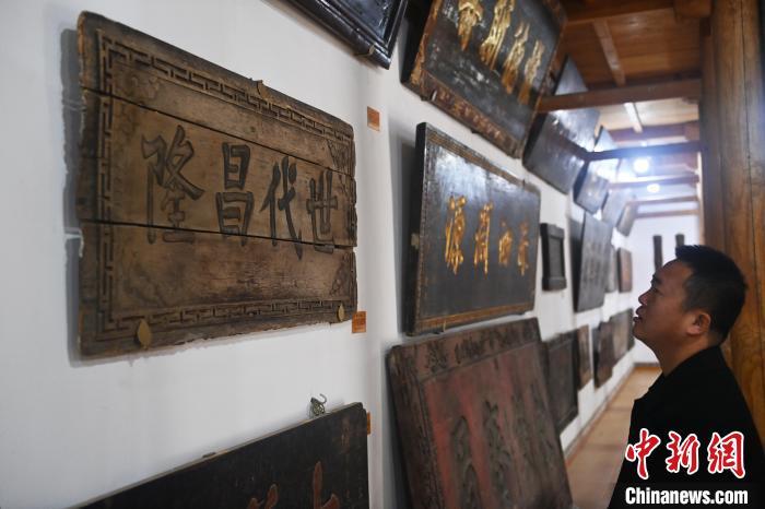 10月23日,甘肅省天水市秦安縣明清街秦安匾額博物館,游人參觀歷史名人胡纘宗所題《世代昌隆》的匾額。中新社記者 李亞龍 攝