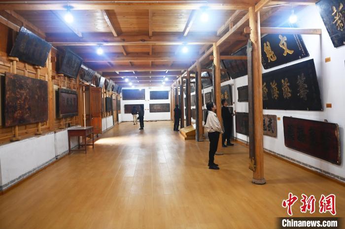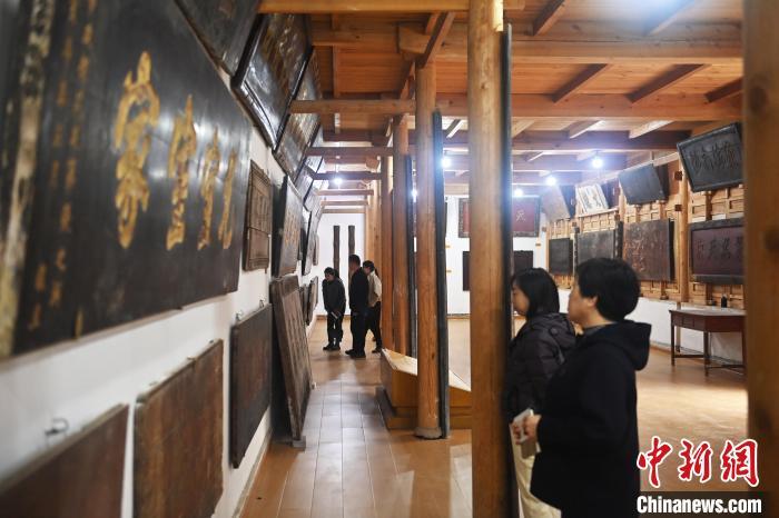 10月23日,甘肅省天水市秦安縣明清街秦安匾額博物館,游人參觀當(dāng)?shù)厥詹氐呢翌~。中新社記者 李亞龍 攝