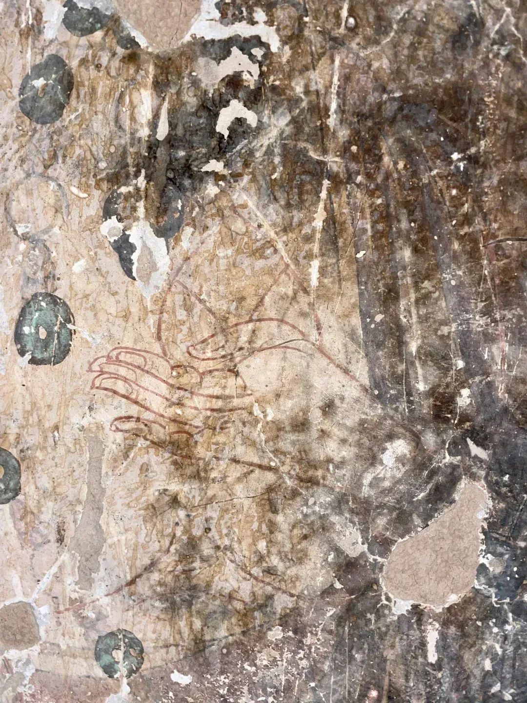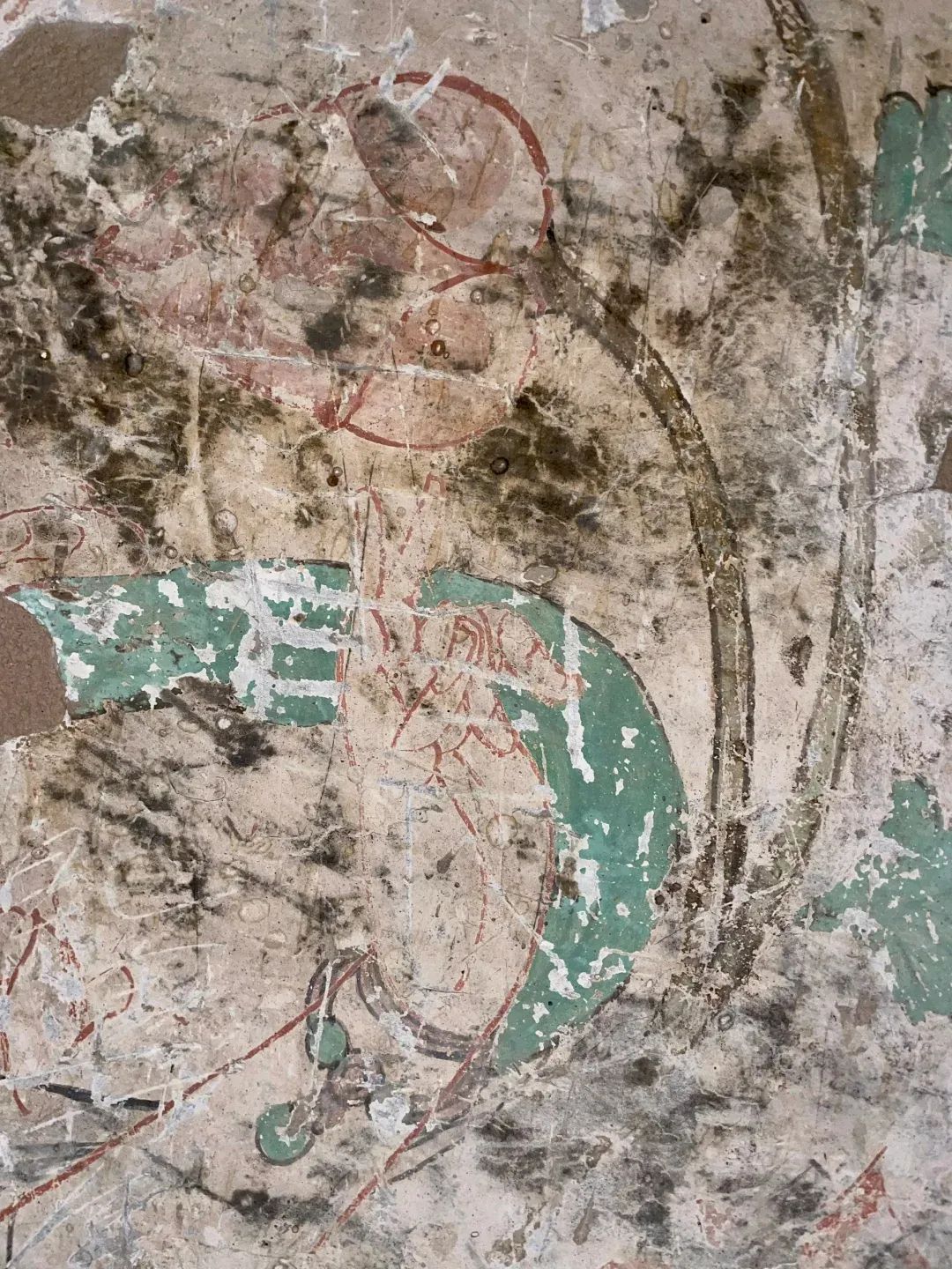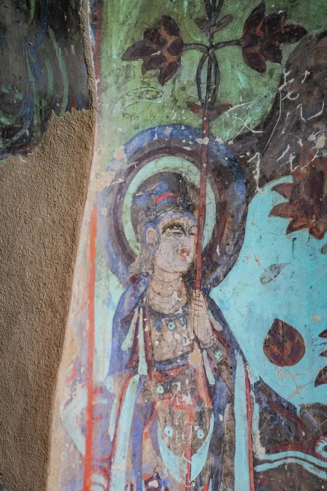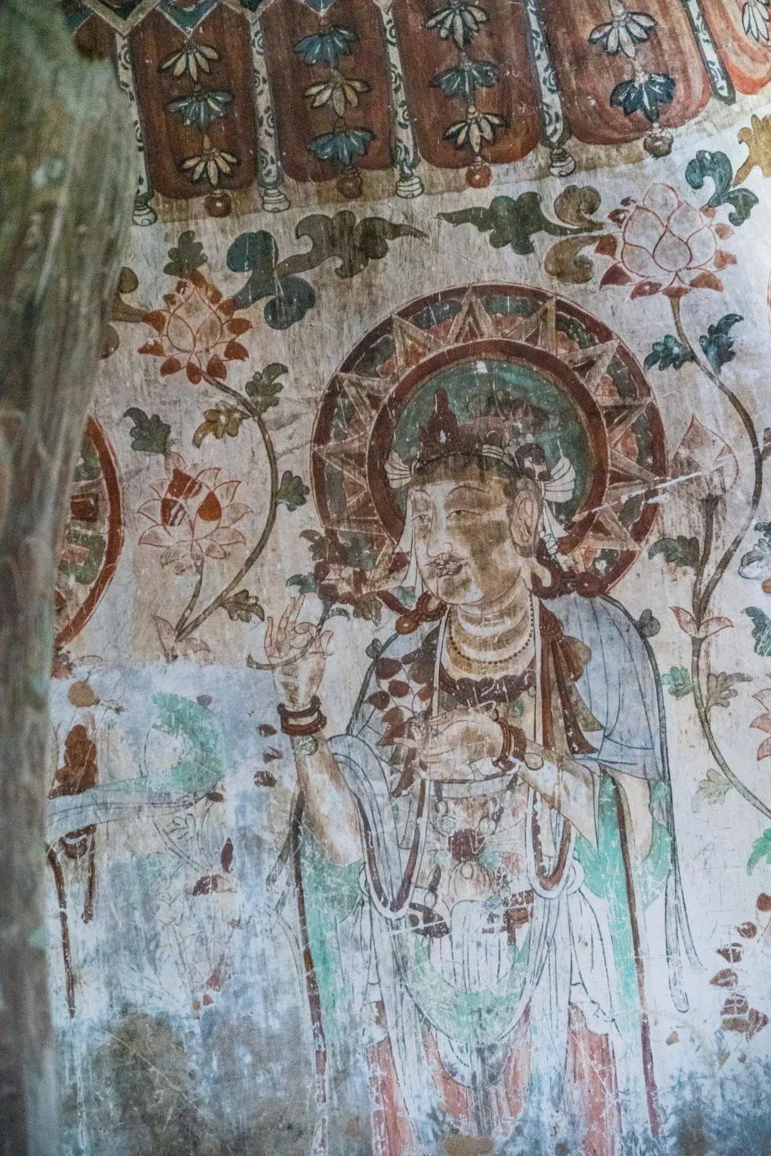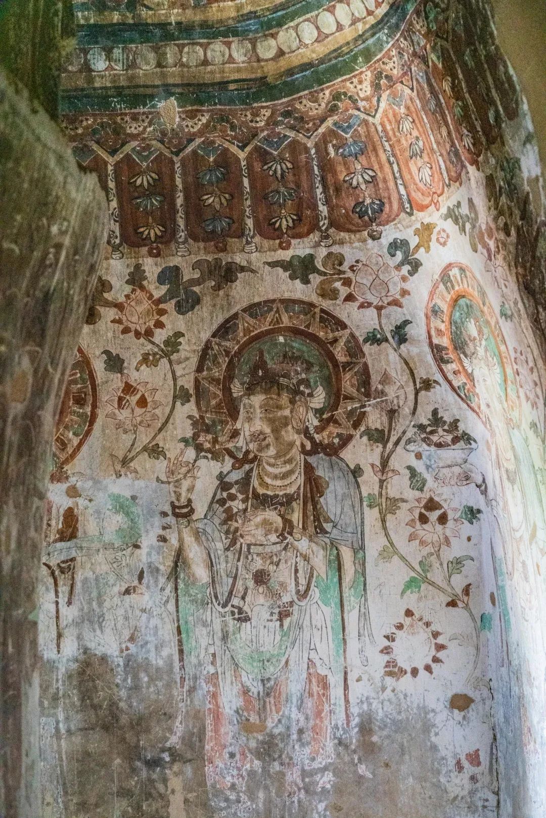 昌馬石窟第4窟洞窟形制及其殘存的塑像對(duì)于研究中國(guó)早期石窟藝術(shù)與佛教造像藝術(shù)極其重要??邇?nèi)壁畫內(nèi)容是四壁上方畫條式旌幡,下畫供養(yǎng)菩薩,身高近2米,今殘存20身,菩薩周圍畫纏枝蓮,與第二窟基本相同。窟頂前半部地仗大部分脫落,靠近中心柱正面上部右側(cè)的部位殘存龜形六瓣團(tuán)花圖案與一身飛天及菊花紋圖案。后部中心柱頂部周圍窟頂表面繪龜形六瓣團(tuán)花、連珠紋等圖案。