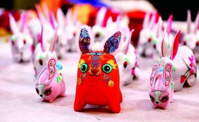慶陽(yáng)香包兔元素?cái)[件。 盤(pán)小美攝