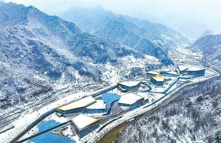 從縣城驅(qū)車不過半小時(shí)的車程,一路青松白雪,生機(jī)盎然。在游客中心,只見一大片水面倒映山川,文房四寶寫意排布,“四水歸堂”巧奪天工,龍軀接連兩岸山勢(shì),天地舒卷,日月提筆,步履為印,山水著墨,我們決定從這里開啟冬日青龍山之旅。