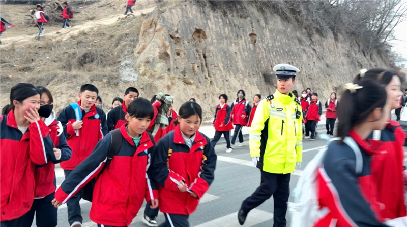 ▲東鄉(xiāng)縣公安局民輔警開展護學(xué)工作,重點在校園周邊開展交通疏導(dǎo)、清理違停車輛、引導(dǎo)學(xué)生安全過馬路。(完瑪草 攝)