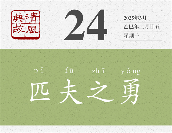 “匹夫”指平民百姓,也指平常人、一般人。起碼在孔子那里,還沒有貶義?!墩撜Z·子罕》:“子曰:‘三軍可奪帥也,匹夫不可奪志也。’”在韓非那里也一樣,《韓非子·有度》:“刑過不避大臣,賞善不遺匹夫。”但典出《國語》的“匹夫之勇”則用來指稱毫無智謀,單憑一己之力蠻干的勇氣,已經(jīng)沒有任何褒義了?!睹献?middot;梁惠王下》:“王請無好小勇。夫撫劍疾視曰,‘彼惡敢當我哉!’此匹夫之勇,敵一人者也。”孟子將“匹夫之勇”稱為“小勇”。蘇軾《留侯論》:“匹夫見辱,拔劍而起,挺身而斗,此不足為勇也。”蘇軾則將“匹夫之勇”視為“不足為勇”。